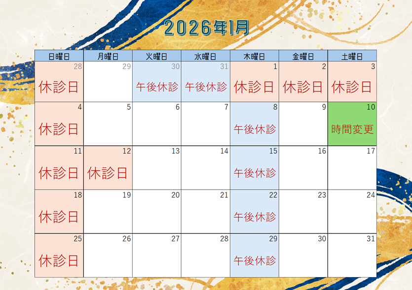 1月の診療日のお知らせ 2025.12.25 通常通り、日曜日は休診いたします。木曜日は午後休診となり診療は午前のみです。1月10日(土)は午後の診療受付時間が18時までとなっておりますので、よろしくお願いいたします。1月12日は『成人の日』で祝日となっており休診です。 年末年始の営業は30日(火)、31日(水)は受付時間を午前9時から午後12時30分までとし、午後は休診となっております。12月31日午後から明けて1月4日までお正月休み、1月5日より通常通り診療の予定です。