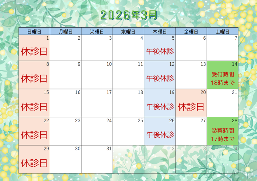 3月の診療日のお知らせ 2026.03.03 2026.02.26 通常通り、日曜日は休診いたします。木曜日は午後休診となり診療は午前のみです。3月20日は『春分の日』で祝日となっており休診です。また、3月14日(土)は午後6時までの受付けとなっておりますのでよろしくお願いいたします。2026年3月3日追記:3月28日(土)の午後の診療時間を午後5時までに変更することとなりましたので、ご注意下さい。