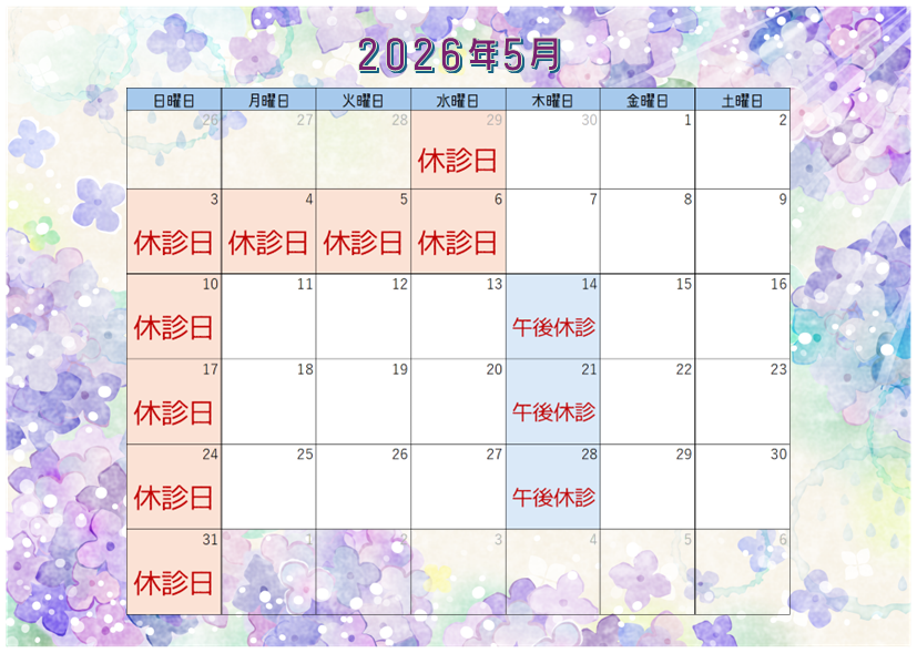 5月の診療日のお知らせ 2026.04.25 通常通り、日曜日は休診いたします。木曜日は午後休診となり診療は午前のみです。5月3日~5月6日 は 祝日となっており休診です。そして、連休明けの5月7日(木)は、終日(午後も6時30分まで)受付け致します。